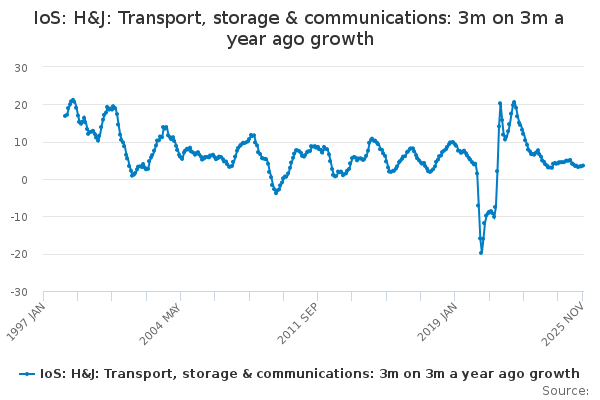 Download this time seriesIoS: H&J: Transport, storage & communications: 3m on 3m a year ago growth