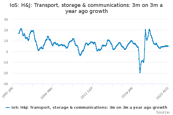 Download this time seriesIoS: H&J: Transport, storage & communications: 3m on 3m a year ago growth