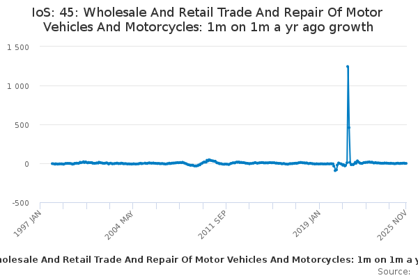 Download this time seriesIoS: 45: Wholesale And Retail Trade And Repair Of Motor Vehicles And Motorcycles: 1m on 1m a yr ago growth