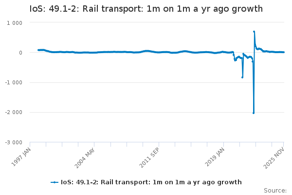 Download this time seriesIoS: 49.1-2: Rail transport: 1m on 1m a yr ago growth