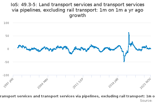 Download this time seriesIoS: 49.3-5: Land transport services and transport services via pipelines, excluding rail transport: 1m on 1m a yr ago growth