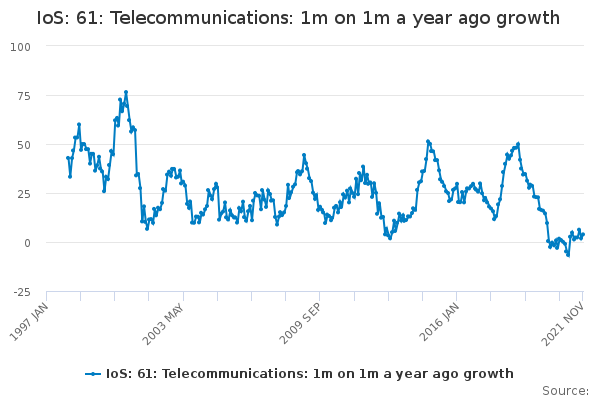 Download this time seriesIoS: 61: Telecommunications: 1m on 1m a year ago growth
