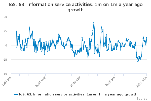Download this time seriesIoS: 63: Information service activities: 1m on 1m a year ago growth
