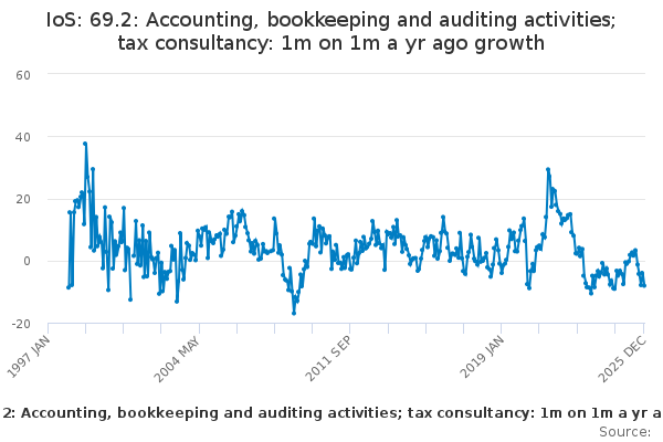 Download this time seriesIoS: 69.2: Accounting, bookkeeping and auditing activities; tax consultancy: 1m on 1m a yr ago growth