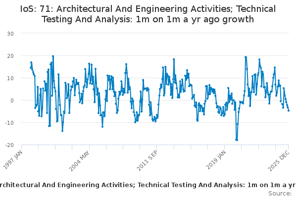Download this time seriesIoS: 71: Architectural And Engineering Activities; Technical Testing And Analysis: 1m on 1m a yr ago growth
