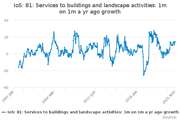 Download this time seriesIoS: 81: Services to buildings and landscape activities: 1m on 1m a yr ago growth
