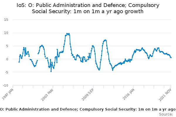 Download this time seriesIoS: O: Public Administration and Defence; Compulsory Social Security: 1m on 1m a yr ago growth