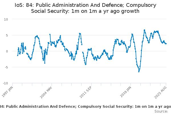 Download this time seriesIoS: 84: Public Administration And Defence; Compulsory Social Security: 1m on 1m a yr ago growth