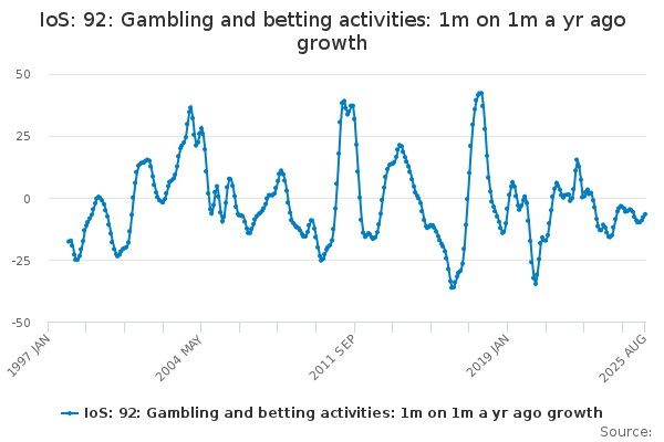 Download this time seriesIoS: 92: Gambling and betting activities: 1m on 1m a yr ago growth