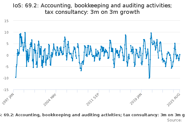 Download this time seriesIoS: 69.2: Accounting, bookkeeping and auditing activities; tax consultancy: 3m on 3m growth