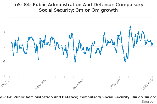 Download this time seriesIoS: 84: Public Administration And Defence; Compulsory Social Security: 3m on 3m growth