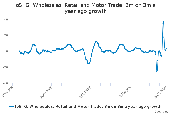 Download this time seriesIoS: G: Wholesales, Retail and Motor Trade: 3m on 3m a year ago growth