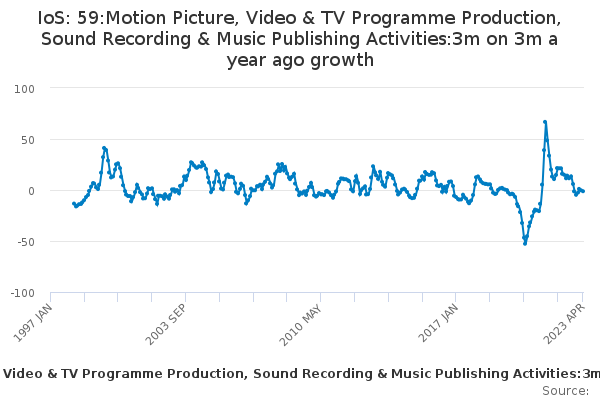 Download this time seriesIoS: 59:Motion Picture, Video & TV Programme Production, Sound Recording & Music Publishing Activities:3m on 3m a year ago growth