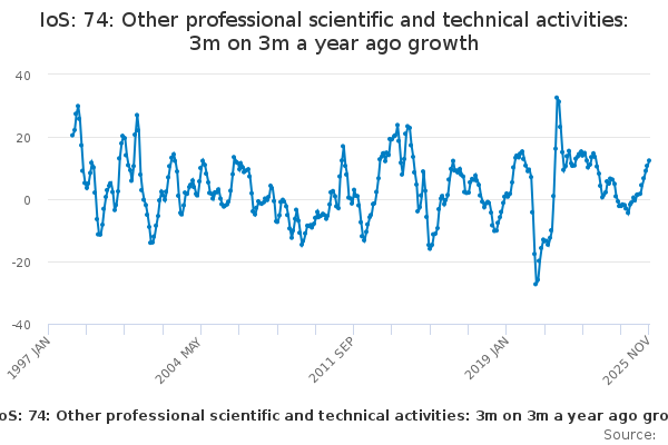 Download this time seriesIoS: 74: Other professional scientific and technical activities: 3m on 3m a year ago growth