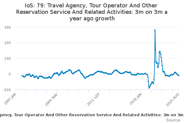 Download this time seriesIoS: 79: Travel Agency, Tour Operator And Other Reservation Service And Related Activities: 3m on 3m a year ago growth