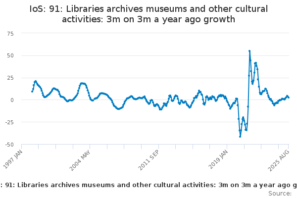 Download this time seriesIoS: 91: Libraries archives museums and other cultural activities: 3m on 3m a year ago growth