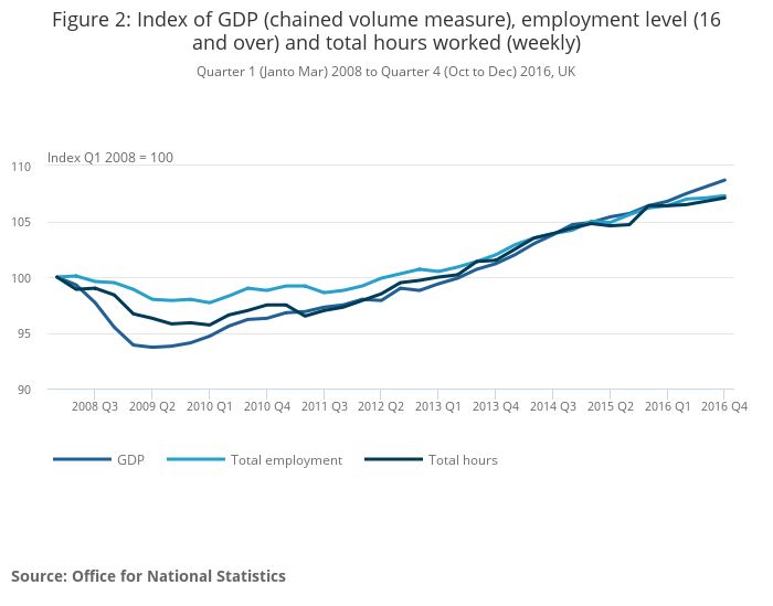 February’s UK Labour Market release shows that there were 31.8 million people aged 16 and over in work in Quarter 4 2016, 38,000 more than the previous quarter and 303,000 more than a year earlier. Growth in output per hour was dampened by total weekly hours worked increasing by 0.3% on the quarter, reflecting an increase of 0.2% in average weekly hours worked and the increase in employment.