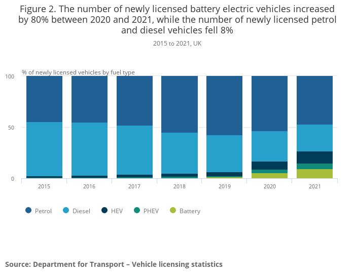 The number of newly licensed battery electric vehicles increased by 80% between 2020 and 2021, while the number of newly licensed petrol and diesel vehicles fell 8%.