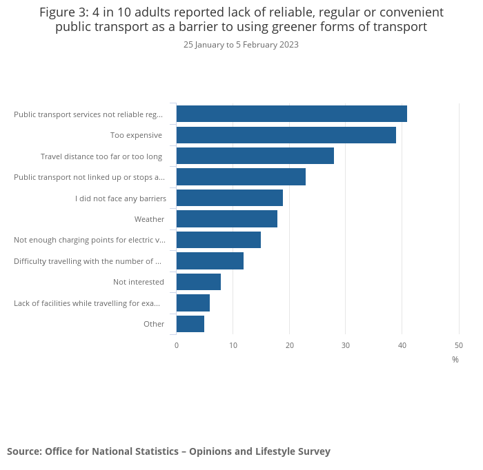 Download this chart Figure 3: 4 in 10 adults reported lack of reliable, regular or convenient public transport as a barrier to using greener forms of transport