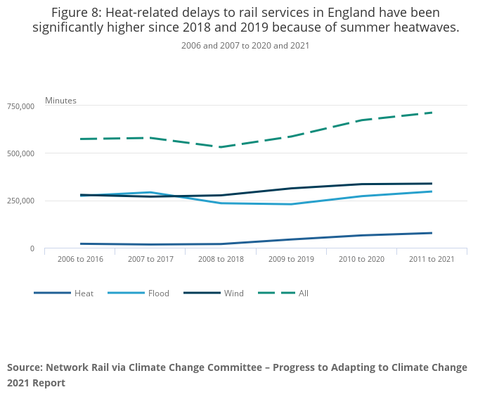 Extreme weather events because of climate change is an increasing risk to transport infrastructure. For rail, Network Rail report in the CCC's Progress in adapting to climate change report, that in financial year 2020 to 2021, national rail services in England were delayed by 128,018 minutes due to heat-related weather events, 289,922 minutes because of floods, and 96,016 minutes because of wind (Figure 8).