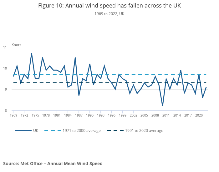 Figure 10: Annual wind speed has fallen across the UK