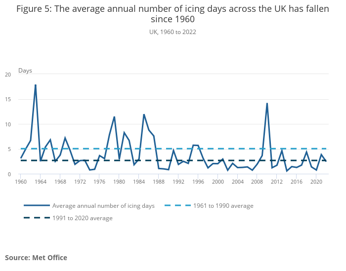 Figure 5: The average annual number of icing days across the UK has fallen since 1960