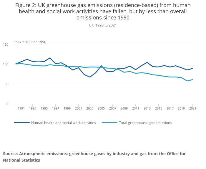 Greenhouse gas emissions, on a residence basis, from the UK's human health and social work sector have fallen by 11% between 1990 and 2021.