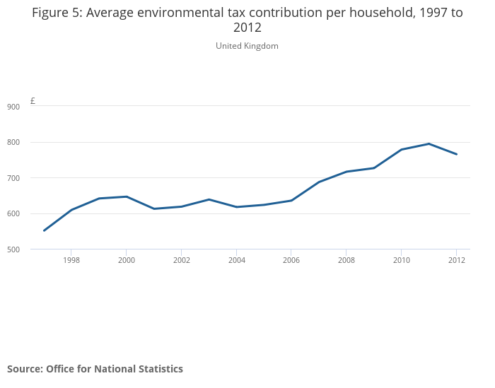 Figure 5 provides an illustration of UK environmental tax paid per household. To achieve this it divides total environmental taxes paid by households in each year by the corresponding number of households. In 2012, environmental tax contribution per household was estimated at £765.
