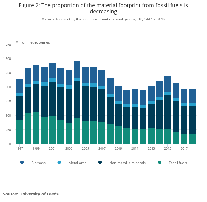The UK’s material footprint was estimated as 971 million tonnes in 2018, equivalent to 14.6 tonnes per person. The consumption of fossil fuels has been falling and was at 178 million tonnes in 2018. This is 68% below its peak in 1999, when it was 566 million tonnes.