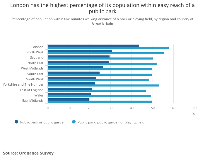 Despite being least likely to have access to a private garden, people living in London are most likely to have a park nearby. OS data show that 44% of Londoners live within a five-minute walk of a park, rising to 58% including playing fields. Both are the highest of any region or country in Great Britain.