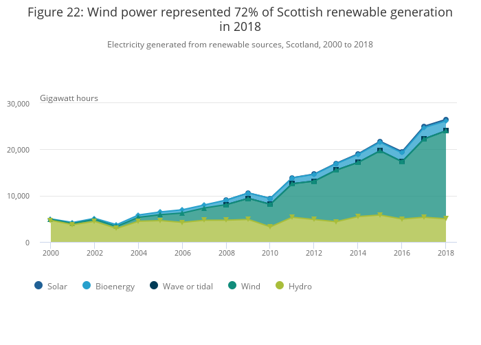 In 2018, renewables made up the majority (55%) of Scottish electricity generation, up from 18% in 2008.