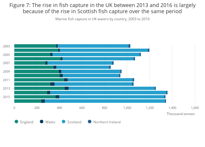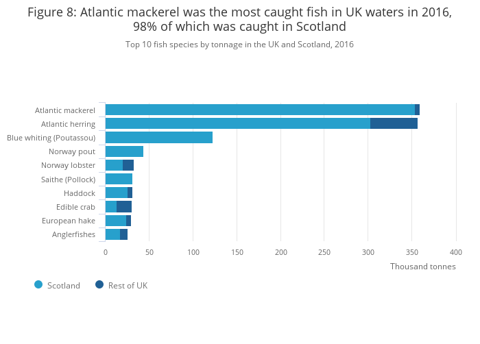 In 2016, nearly four-fifths of total UK waters fish capture was caught in Scottish waters.