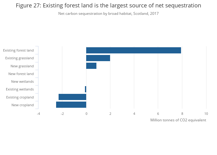 Estimates relate to the removal of carbon dioxide equivalent (CO2e) from the atmosphere by habitats in Scotland. However, because of a lack of data we are unable to include the marine habitat, including those intertidal areas such as saltmarsh. Furthermore, peatlands are only partially covered. The Centre for Ecology and Hydrology estimates that damaged peatland in Scotland emitted 9.3 million tonnes of CO2 equivalent. This nearly completely negated the gross terrestrial sequestration of Scotland reported in the Greenhouse Gas Inventory (GGI).