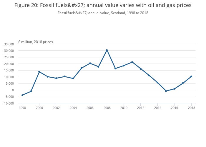 For the asset valuation of fossil fuels an asset life of 25 years has been assumed. Asset valuation utilises annual projected UK oil and gas production from the OGA until 2035. Then, following OGA methodology, assumes a further 5% production decline per year (for all years following 2035) to be able to project over the full 25-year asset lifetime. UK production projections are apportioned for Scotland based upon the last five years of Scottish contribution to UK production. To estimate valuations in future years annual five-year averages of “unit resource rent” (average resource rent divided by average production) are applied to production projections.