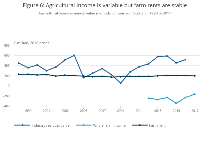 Previous Scottish natural capital accounts have provided resource rent annual valuations using the residual value approach. This is the surplus value to the agricultural industry after all costs have been considered. Estimated at an aggregate scale it may include non-agricultural aspects of farm businesses.