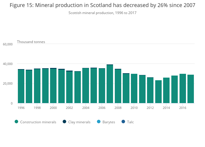Monetary estimates of oil and gas are based on the methodology published by the ONS in June 2013, following a “residual value” resource rent approach calculated from the SIC subdivision class: Extraction of crude petroleum and natural gas (SIC 06). Production statistics are combined with oil and gas price data supplied by the Oil and Gas Authority (OGA) to calculate income. Deductions are then made for operating expenditure, from the Scottish Government, and user costs of produced assets, from ONS UK capital stocks data. The factor used for apportioning net capital stocks and consumption of fixed capital was the proportional annual relationship between Scotland and UK oil and gas capital expenditure.