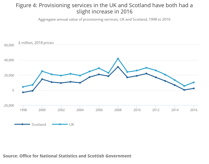 Aggregate annual value of provisioning services, UK and Scotland, 1998 to 2016