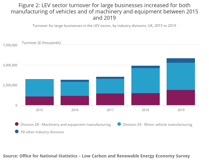 Within the manufacturing industry and again focusing on large businesses that are active in the LEV sector, the manufacture of motor vehicles, trailers and semi-trailers (Standard Industrial Classification (SIC), Division 29) accounted for 57.2% (£3.3 billion) of the LEV sector turnover in 2019, while machinery and equipment manufacturing (SIC Division 28) accounted for 33.2% (£1.9 billion) in 2019. From 2015 to 2019, turnover for large businesses has increased by £1.3 billion for motor vehicle manufacturing and by £0.8 billion for manufacturing of machinery and equipment.
