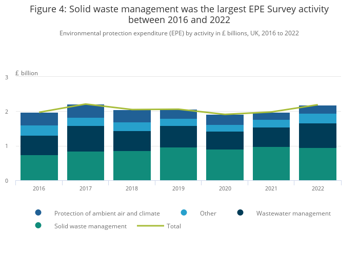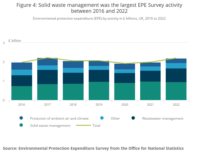 Solid waste management remained the largest EPE activity covered by the survey, with £0.9 billion of expenditure in 2022, 40.9% of the total.