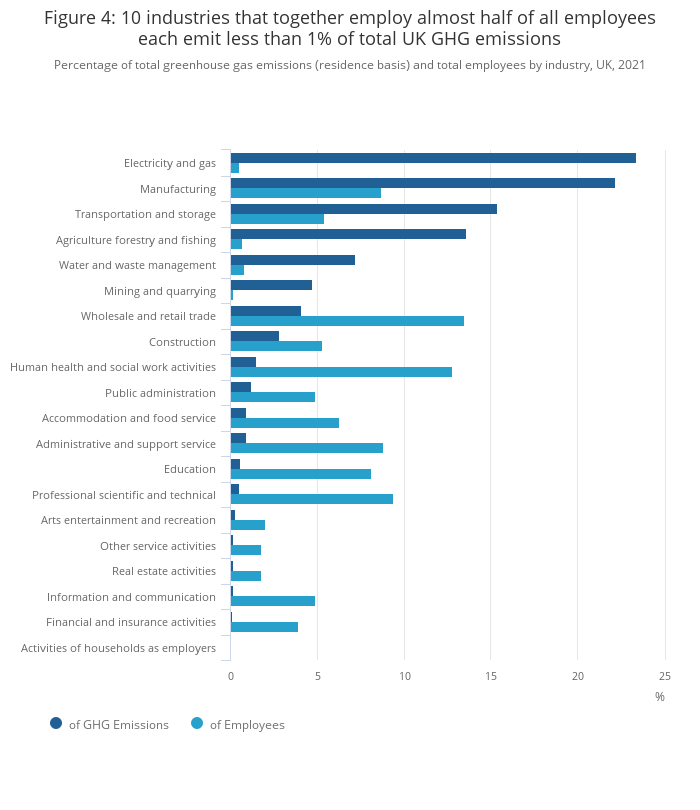 Nearly half (47%) of UK employees worked in 1 of 10 industries that accounted for less than 1% of total UK greenhouse gas (GHG) emissions in 2021.