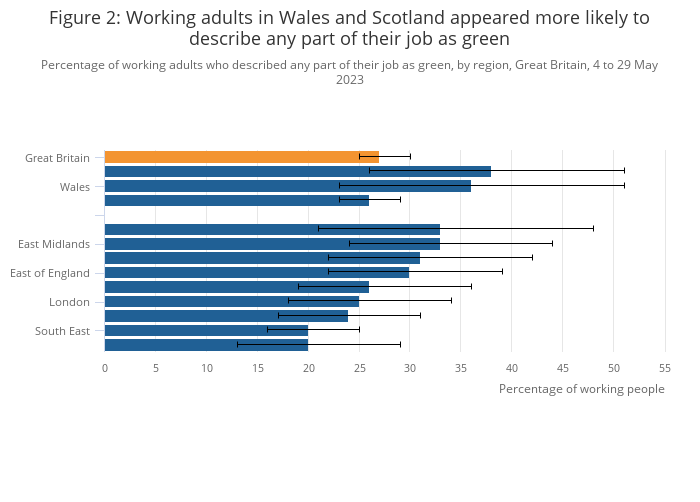 Around a quarter (27%) of working adults in Great Britain reported in May 2023 that they would describe any part of their job as a "green job", while around 1 in 20 (4%) reported that all or most of their job relates to "green" activities.