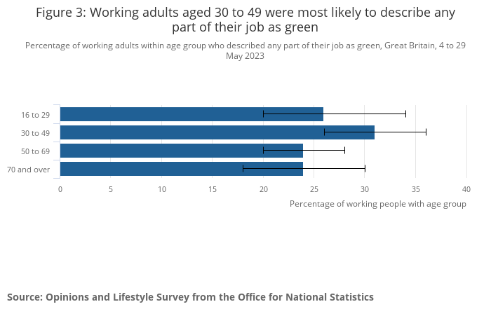 Percentage of working adults within age group who described any part of their job as green, Great Britain, 4 to 29 May 2023