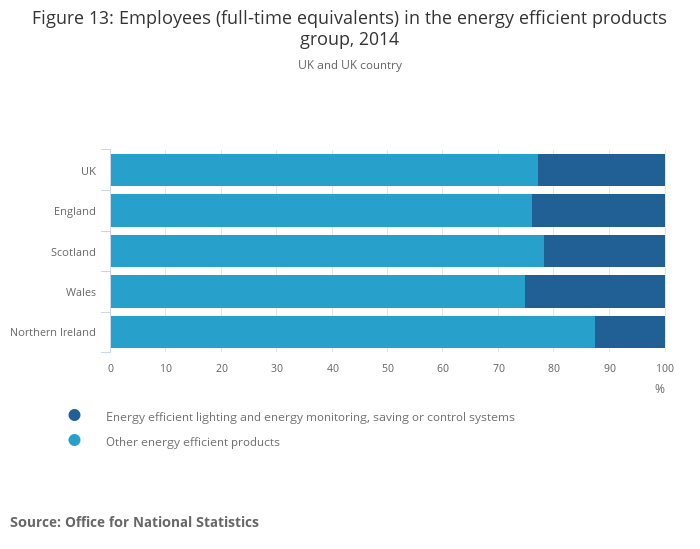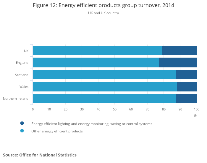 The other energy efficient products sector generated the greatest turnover in this group, 78.8% (£17.2 billion), for the UK in 2014 (Figure 12). This contribution was similar across the UK countries, with the sector generating 77.3% (£14.5 billion) of group turnover in England, 87.4% (£1.8 billion) in Scotland, 88.0% (£644 million) in Wales and 87.4% (£330 million) in Northern Ireland.