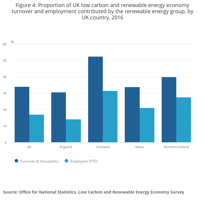 - In 2016, almost half (45.8%) of the UK’s turnover from onshore wind activities was generated in Scotland (£1.5 billion); by contrast, over 80% (£2.4 billion) of the UK’s turnover from offshore wind activities was generated in England.