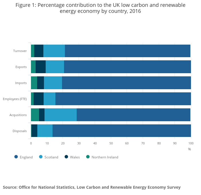 Regional estimates and country-level data are presented throughout this release. These estimates are based on where the activity takes place, rather than where the business is registered. For example, if a business in England owns a wind farm in Scotland then the activity would be allocated to Scotland. This should be taken into consideration when comparing these results to estimates of low carbon activity from other sources, which may be based on where the business is registered.