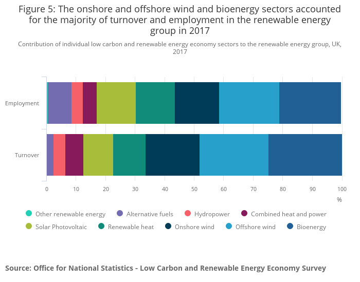 Download this chart Figure 5: The onshore and offshore wind and bioenergy sectors accounted for the majority of turnover and employment in the renewable energy group in 2017