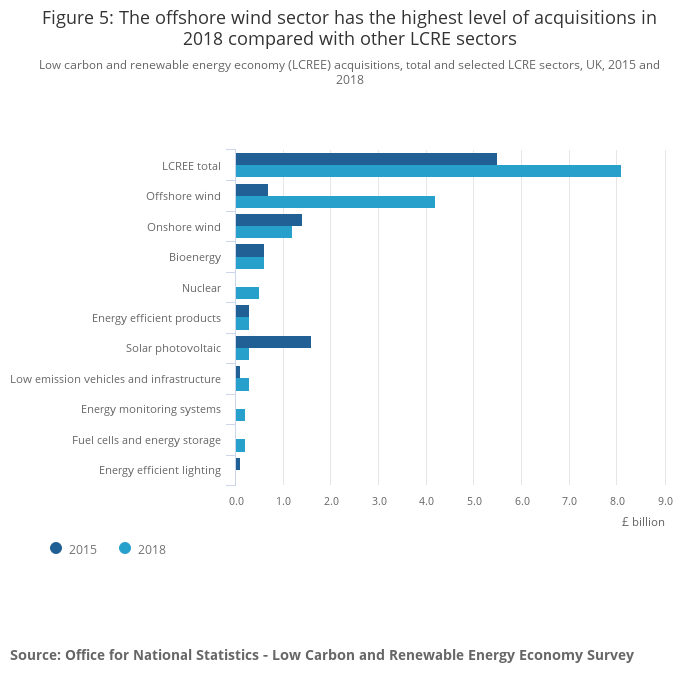 Total investment in the LCREE increased by 48% between 2015 and 2018, to stand at £8.1 billion in 2018; this was mainly the result of a rise in acquisitions by the offshore wind sector (up £3.5 billion between 2015 and 2018).