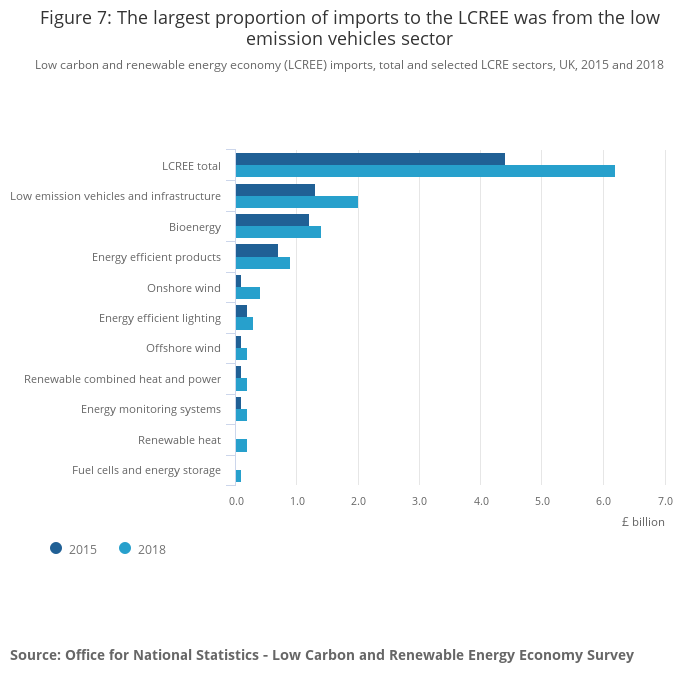 Image .csv .xlsThe import of goods and services by businesses active in the UK LCREE has increased since 2015, with imports of £6.2 billion in 2018 and £4.4 in 2015 billion (Figure 7). The largest proportion of expenditure on imports of goods and services was also within the low emission vehicles sector accounting for one-third of the total UK LCREE imports in 2018.