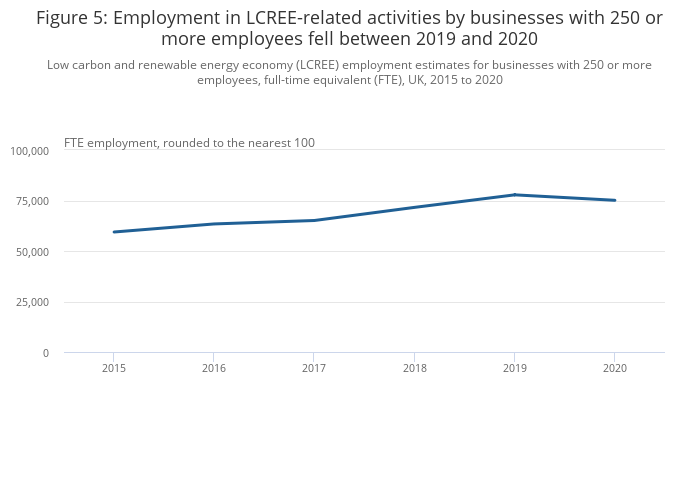 Low carbon and renewable energy economy (LCREE) employment estimates for businesses with 250 or more employees, full-time equivalent (FTE), UK, 2015 to 2020