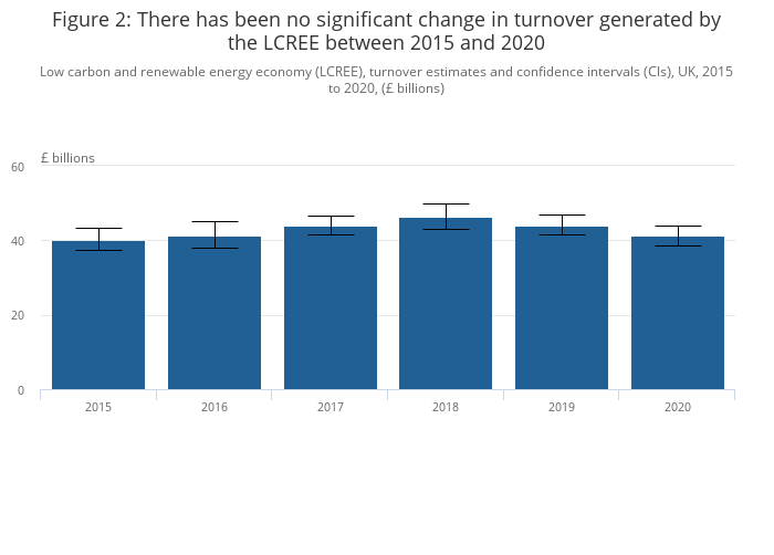 Turnover in the UK low carbon and renewable energy economy (LCREE) was estimated to be £41.2 billion in 2020, with no significant change since 2014 when the survey began.